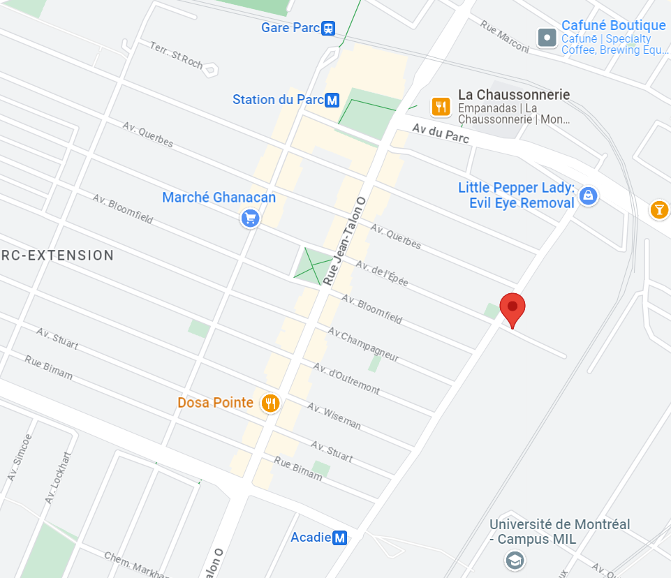 Métro ACADIE (4 minutes de marche) ou du PARC (9 minutes de marche) ou autobus ligne 180 avenue du Parc, descendre au coin de Beaumont (2 minutes de marche). Borne BIXI au coin de l’avenue Querbes et Beaumont.